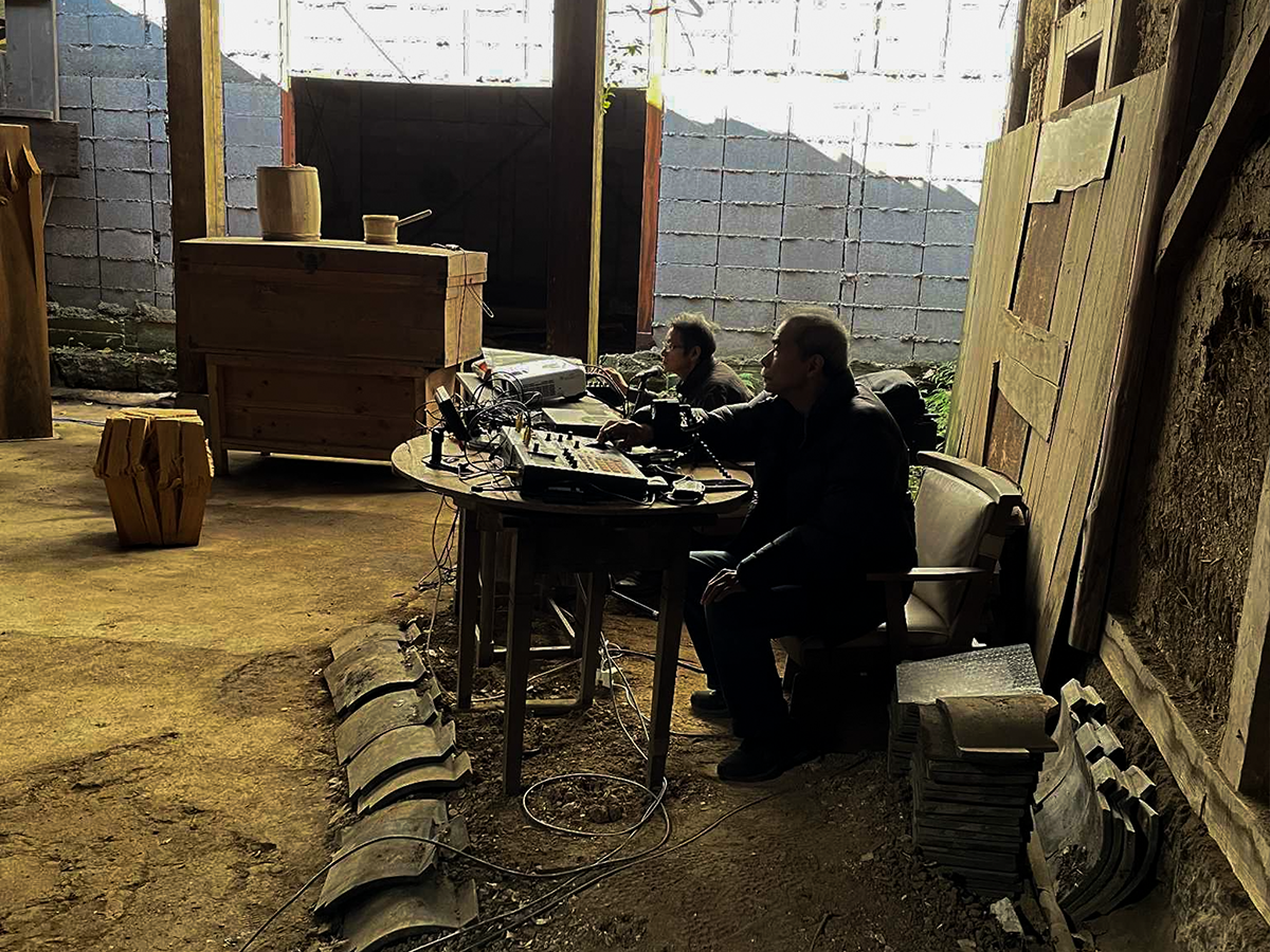 今回会場を訪れたとき、彫刻家・森貴也さんがインスタレーションをほぼ完成の状態にしていた。なのに何かがしっくりとこない。考えてみると森さんの作品が一体も見当たらない。森さんにお願いした。森さんの作品を組み込んでほしいなと。次の日会場を訪れた時インスタレーションは完成の状態だった。そこには木材を圧縮してでできた作品が何十体も配置され重量感を感じさせるものだった。この空間に映像を投影するのが楽しみになった。7000ルーメンのビデオプロジェクターが用意された。このプロジェクターは映画を上映するものらしく、被写体と光源との距離は、レンズを交換して使うものらしい。レンズは近・中・遠と3本あった。